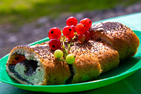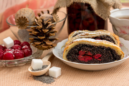 Poppy seed strudel with cherry on the sacking