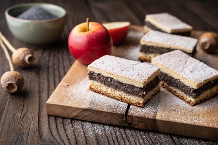 Delicious pie made from leavened dough with poppy seed and apple filling, sprinkled with powdered sugar on rustic wooden background