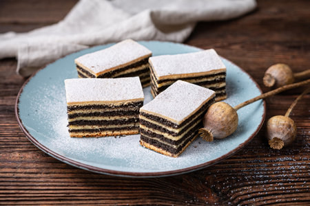 Sweet dessert, layered poppy seed cake dusted with powdered sugar