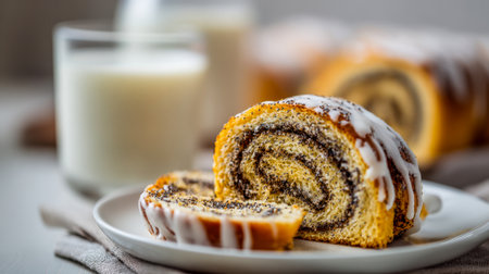 A fragrant, golden-brown pastry dotted with poppy seeds, drizzled with smooth white glaze, paired with a tall glass of milk?perfect for comforting mornings or sweet