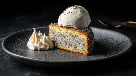 Delicious poppy seed cake slice with whipped cream and ice cream on dark plate.