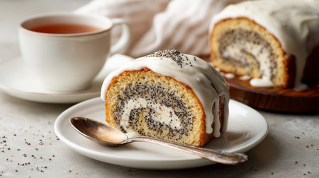 Poppy seed roll icing slice dessert tea spoon porcelain cup swirl glaze bakery moist crumb citrus zest creamy filling sweet breakfast brunch snack