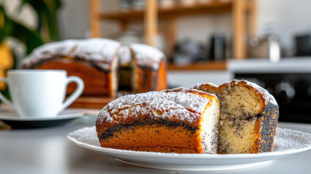 A beautifully baked poppy seed cake dusted with powdered sugar, served with a warm cup of coffee, creating a cozy kitchen setting perfect for sharing.