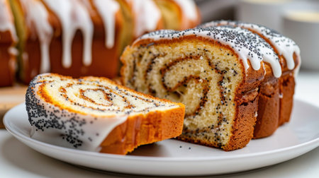 A beautifully presented slice of sweet bread with poppy seeds, topped with smooth icing, ideal for dessert or a delightful breakfast treat.