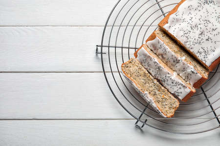Cooling grid with delicious glazed poppy seed cake on white wooden background