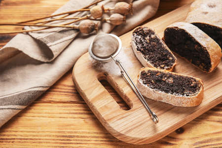 Board with cut poppy seed strudel on wooden background