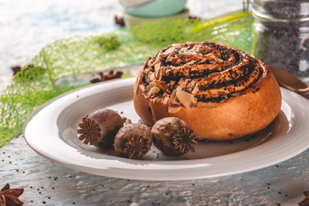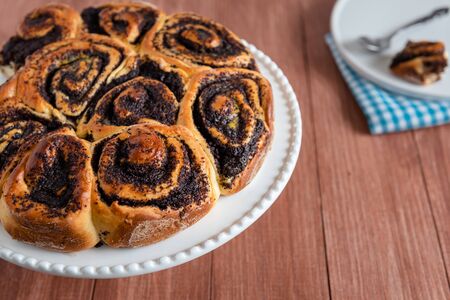Close-up of a pie with poppy seed filling. Sweet bun with poppy seeds.