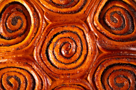Freshly baked sweet cinnamon bun roll swirl pattern background