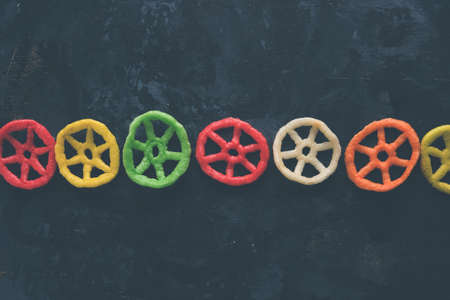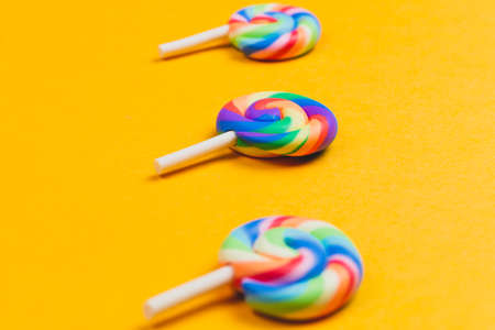 Overhead close-up view of scattered lollipops against yellow background. unaltered, unhealthy eating and sweet food concept.