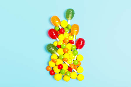 Various sweets assortment. Candy lollipops over blue background. Top view flat lay