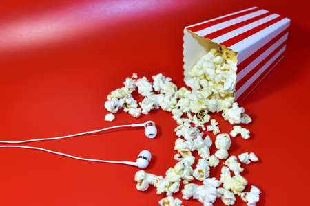 Popcorn in colored cardboard packaging with headphones for listening to music and watching a movie. Heap of salted popcorn in paper striped bucketon a red background.