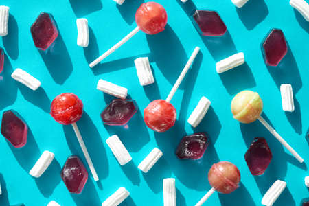 Colorful composition of sweets for every taste: appetizing lollipops, light and airy marshmallows and candied fruit jelly lying in disorder against blue background, directly above view