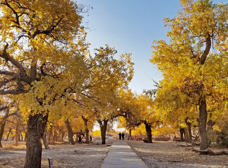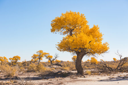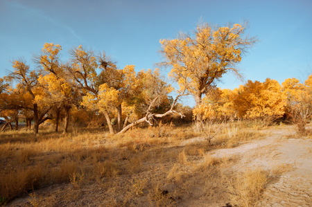 Populus euphrateca trees with yellow leaves in the autumn,in Ejina,Inner Mongolia, China. Nature background.