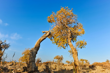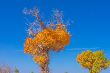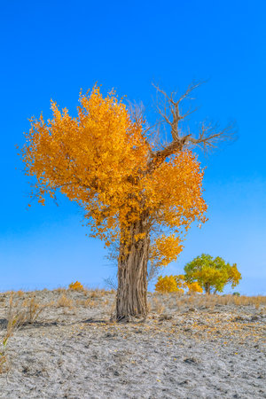 Populus euphratica tree in autumn with blue sky background,in Ejina,inner Mongolia, China