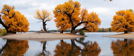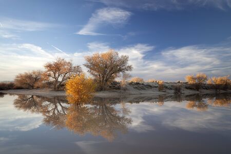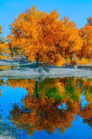Populus euphratica trees with yellow leaves in the autumn on the bank of the river, in Ejina, Inner Mongolia, China