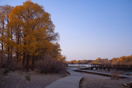 Populus euphratica or desert poplar trees with brilliant autumn foliage colors line a pedestrian boardwalk in an Inner Mongolia desert oasis. -04
