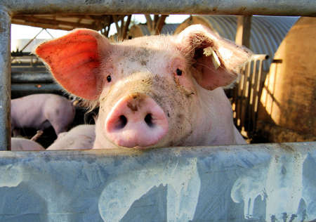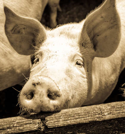 Happy pig with dirty snout poses for the camera. Domestic animals farming.