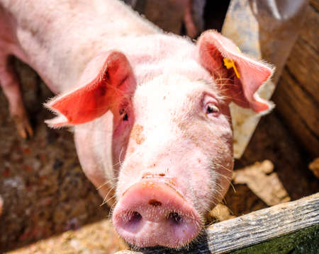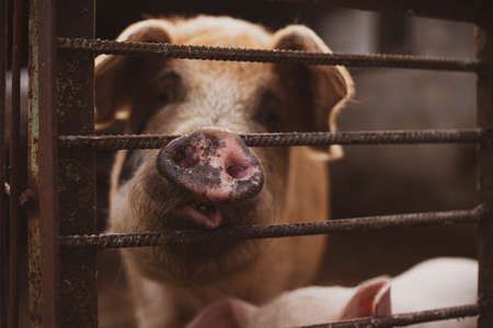 Close-up of hungry curious pig looks at the camera behind a fence on a farm on a summers day. The eyes are in focus with a shallow depth of field
