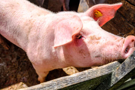 A piglet with a pink nose, a piglet peeps out of a house on a pig farm waiting for food for the holiday
