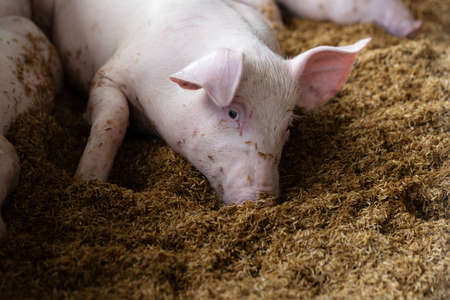 Small piglet sleep in the farm. Group of Mammal indoor waiting feed. swine in the stall. Close up eyes and blur.