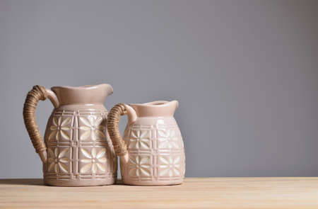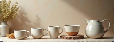 Ceramic dishes on a wooden table. Mug, jug, plate. High quality illustration