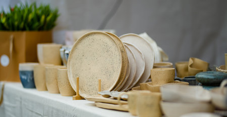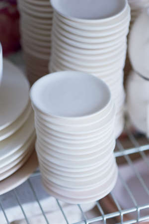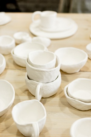 Matt ceramic handmade tableware in a workshop closeup, shallow focus