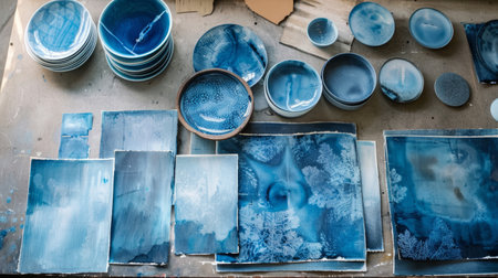 Top-Down View of Cyanotype Artworks and Blue Ceramic Dishes. Artistic Composition in Blue Tones.