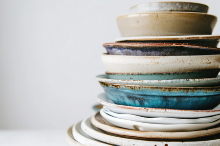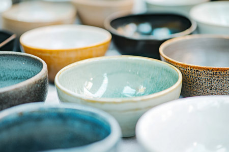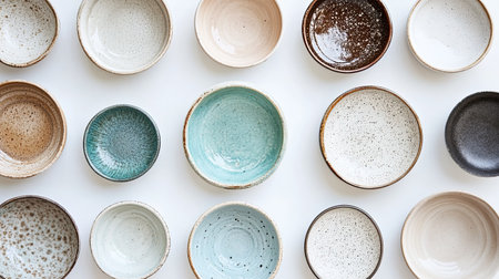 Vibrant collection of empty ceramic bowls in a variety of colors and textures resting on a white tabletop, highlighting exquisite craftsmanship and thoughtful design elements