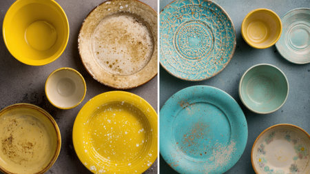A side-by-side view captures dirty dishes on one side and clean, organized dishes on the other, illustrating the washing effect.