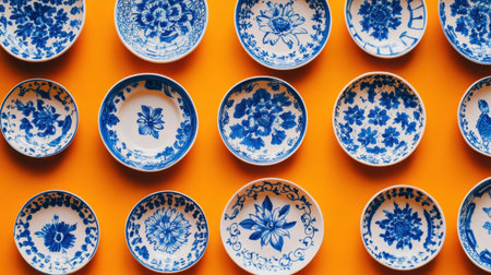 A stunning display of blue and white decorative plates highlights intricate floral patterns against a bright orange background, showcasing aesthetic appeal.