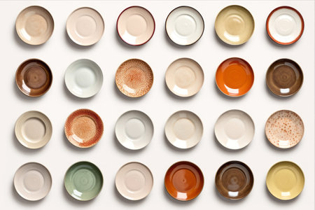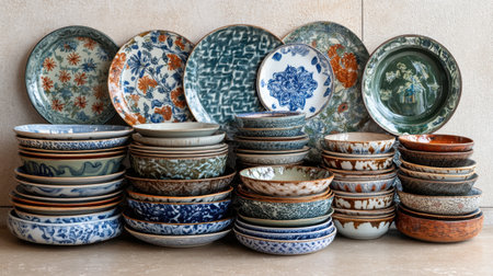 An artistic display of colorful ceramic plates and bowls showcasing intricate designs and textures, perfect for enhancing any dining space or collection.