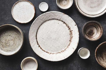 handmade ceramics, empty craft ceramic plates and bowls on light background