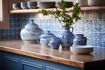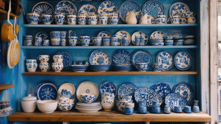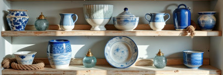 Display of a beautiful collection of blue and white ceramic dishes arranged on wooden shelves, showcasing exquisite patterns and vintage charm in a cozy kitchen setting.