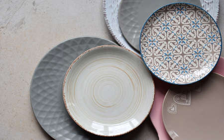 Multicolored empty ceramic plates and bowls on a marble background. Table setting. Shabby chic or retro style. Copy space. Mock up, concept for restaurant, menu.