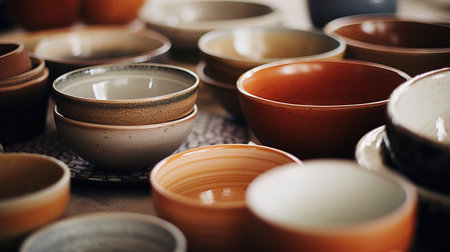Generative AI, crafted pottery, still life of hand made pottery and ceramic bowls, hobby and leisure concept