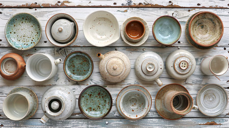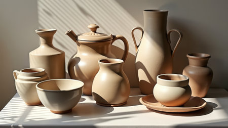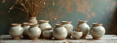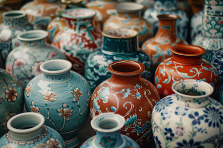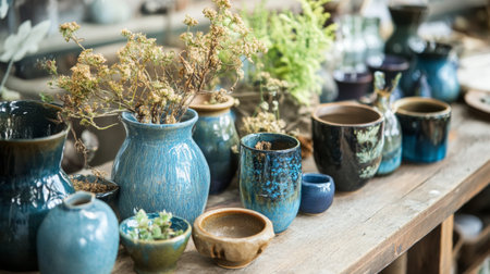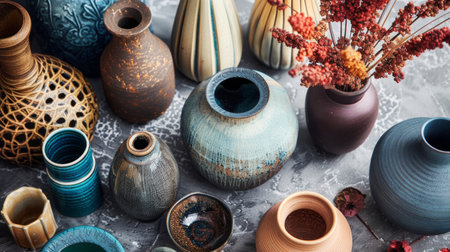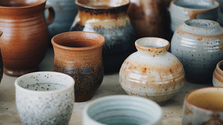 Collection of artisan pottery and vases, showcasing various shapes, colors, and textures. Perfect for arts, crafts, and handmade product themes.