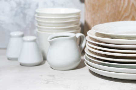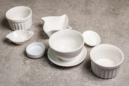 Assorted white empty bowls and plates on a stone background. Different ceramic dishes and kitchen utensils, copy space
