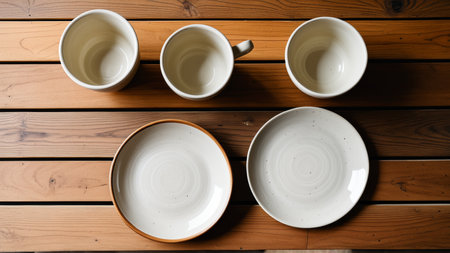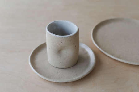 ceramic cup and plates on a wooden table top view. minimalist set of handmade ceramic tableware and pottery