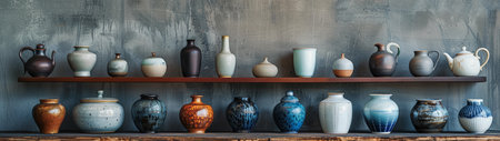 This wide-format image captures an array of ceramic pottery and teapots, each piece a testament to the skill of traditional Chinese craftsmanship. The collection is displayed on a wooden shelf against a distressed grey backdrop, with a variety of shapes, sizes, and colors. The ceramics range from deep blues and earthy browns to subtle greys and whites, some with elegant patterns, others with a simple, monochromatic glaze. This sophisticated composition is perfect for interior design themes, highlighting the beauty of handcrafted art and the quiet grace of ceramic ware.