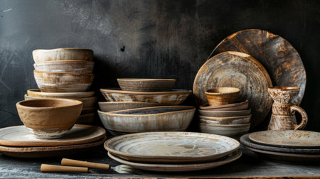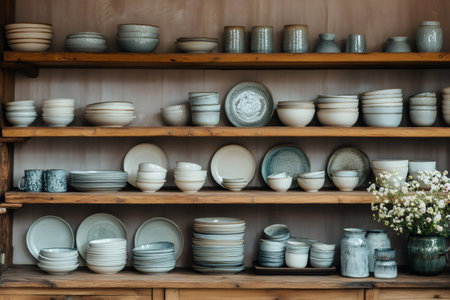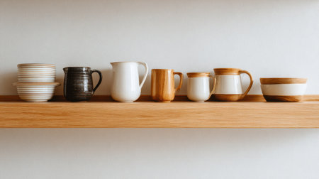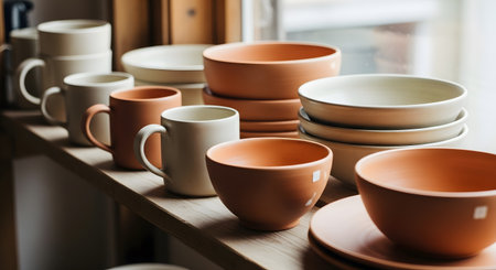 Capture handmade ceramic tableware. Explore studio pottery and contemporary stoneware design displayed on wooden shelf. Uncover handcrafted ceramics, bowls, mugs, plates, cups and artisan design. AI Generative AI generated