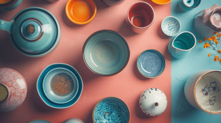 Colorful ceramic bowls and cups arranged on a pink and blue surface. The vibrant colors and varied designs create a playful and artistic display.