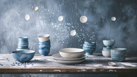 Ceramic bowls in various sizes and colors floating in mid-air with flour dusting around them, creating an artistic and dreamy atmosphere, perfect for themes related to ceramics, art, and creativity.