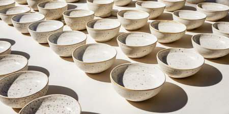 Minimalist ceramic bowls arranged in neat rows on sunlit surface. Tableware concept for modern kitchens, artisanal pottery, stylish dining presentations, kitchen branding and dishware advertising