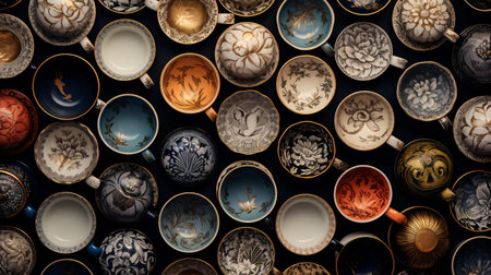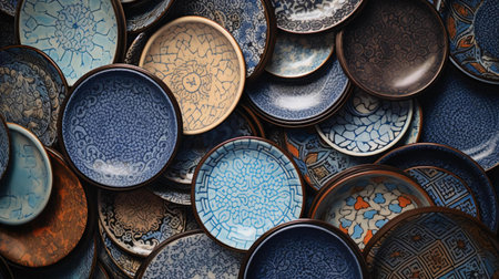 Antique earthenware pottery collection, ornate patterned ceramics for kitchen decoration generated by artificial intelligence
