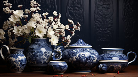 An elegant display of delicate ceramic vases and jars, adorned with vibrant flowers, adds a touch of sophistication to any indoor space