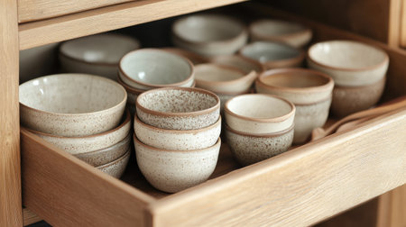 A beautifully arranged collection of handmade ceramic bowls in a wooden drawer, showcasing various textures and elegant neutral colors ideal for enhancing kitchen ambiance.