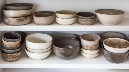 A visually appealing collection of ceramic bowls in soft neutral tones arranged on a modern shelf, perfect for adding a touch of elegance and functionality to any kitchen decor.