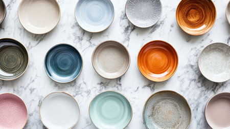 Explore a visually stunning display of various ceramic bowls showcasing intricate textures and vibrant colors, ideal for enhancing culinary presentations and kitchen aesthetics.