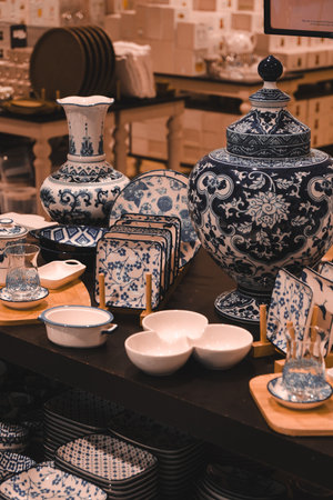 Discover a stunning display of blue and white porcelain dinnerware, showcasing intricate designs and craftsmanship, perfect for enhancing any kitchen or dining space.