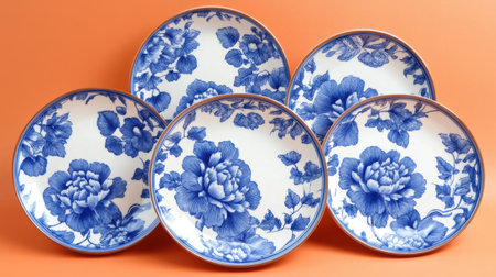 This captivating image features a collection of elegant blue and white ceramic plates adorned with floral patterns, set against a vivid orange backdrop.